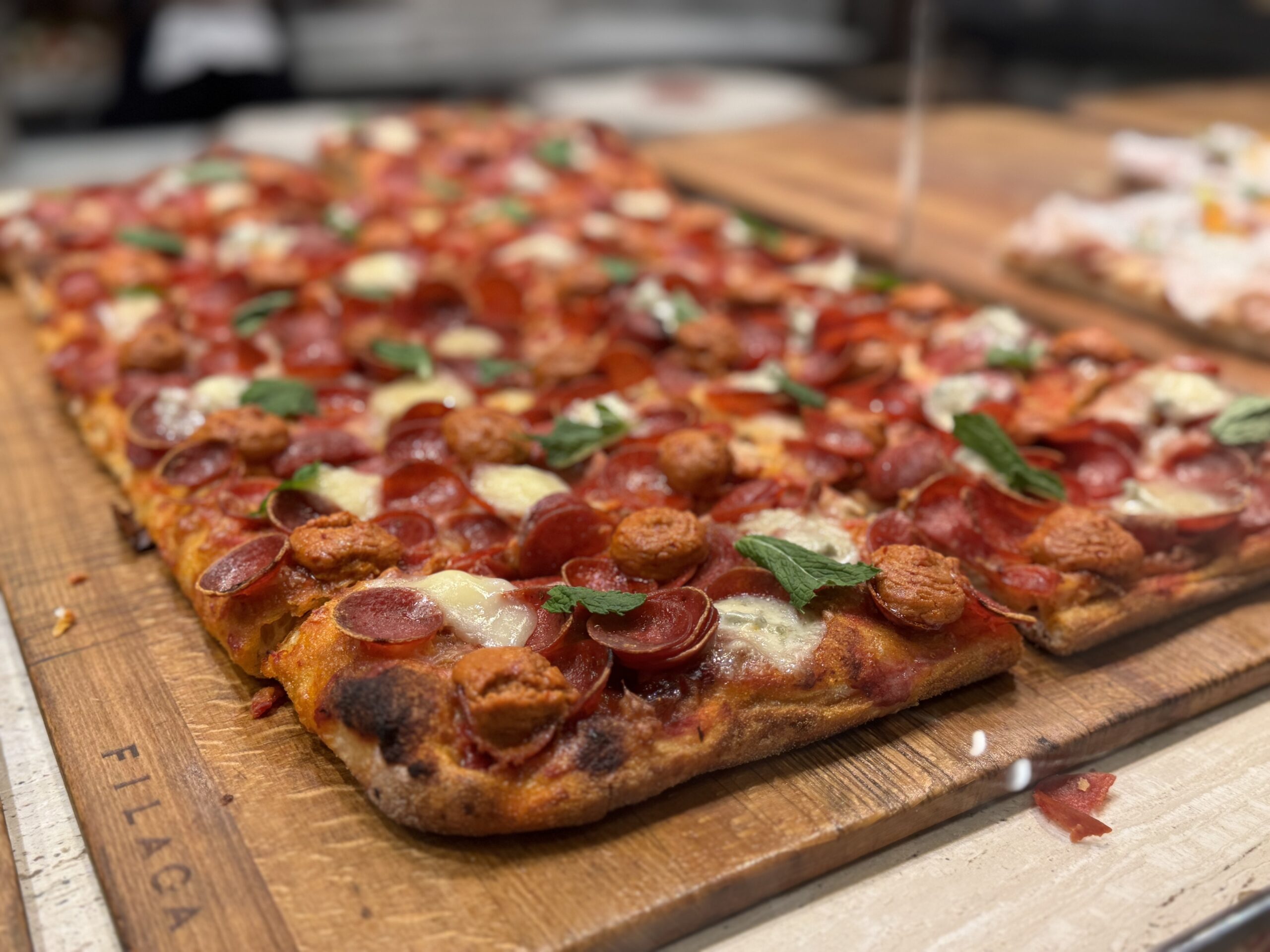 Mangiare da Filaga è un gesto rapido – si ordina, si appoggiano i gomiti sul legno, si morde – ma il morso rallenta tutto. Forse è questo che conquista i newyorkesi: l’idea che un cibo così semplice possa ancora avere un’identità forte, senza sovrastrutture. Che un quadrato di pizza possa parlare di sole, piazze, forno acceso, tempo lento. Che un assaggio arrivi da lontano senza bisogno di spiegarsi.