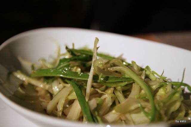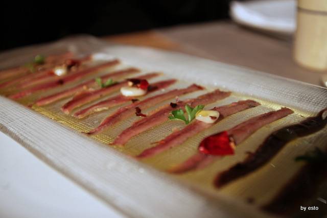 Qualche istante ed ecco apparire: una crema di patate con polpettine di maiale arruscatelle e mollica di pane fritto; alici di Cetara; le puntarelle all’agro; un carpaccio di scottona bianca dell’appennino, sedicente chianina; l’ olio del Ciomei, il burro del Laceno e pane cafone.