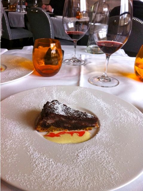 Sia io che la moglie siamo tentati da questi vassoioni quadrati di grande effetto visivo e indubbiamente originali nella loro proposta ‘leggera’ per il pranzo, ma poi preferiamo ordinare alla carta: insalata di arance con la pancetta affumicata, pappardelle al cinghiale, ravioli di patate con fonduta di parmigiano e salvia, filettino di manzo al balsamico invecchiato e la torta di pere. Accompagnamo il tutto con il rosso di Montalcino Castiglion del Bosco 2008: vino dignitosissimo, gradevole, ad un costo ragionevolmente contenuto.