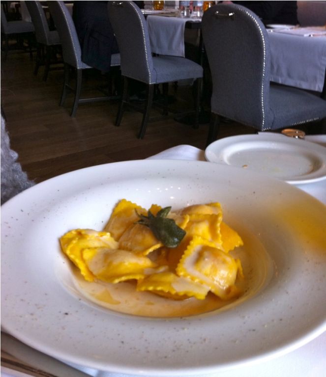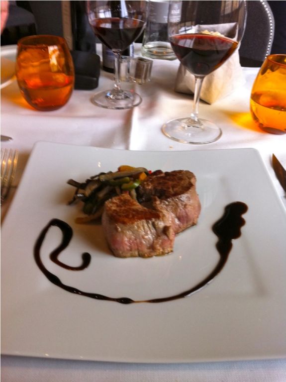 L’insalata (già parzialmente condita) è gustosa, profumata e fresca ma….pur sempre un’insalata anche se resa più appetitosa dal bacon e dalle scaglie di formaggio. Le pappardelle sono cotte a puntino e condite con un sugo sapientemente ingentilito che non ha quasi niente del tipico retrogusto selvatico dell’ungulato. I ravioli, al primo impatto meno delicati e più corposi, si rivelano perfettamente legati tra ripieno e condimento di formaggio. Le porzioni non sono abbondantissime ma neanche risicate come avviene invece in ristoranti…di un certo tono, dove alla fine si esce ancora affamati. Il filetto di manzo, servito con delle verdurine a jeulienne non era invece tra i migliori: cottura leggermente “oltre il sangue” e, ahimé, appena tiepido, sul finire quasi freddo. Apprezzabile e gustoso il dessert.