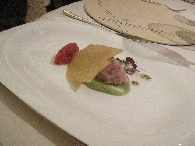 Piatto che noi vetero- gastro appassionati definiremmo “ruffiano”. Giochi di consistenze perfetti, sensazioni caldo –freddo intriganti , acciuga del cantabrico di livello stellare che sta “oltre” il sale, direi perfino dolcissima. Un piatto di classe franco-italiano nella sua semplice concettualità.
