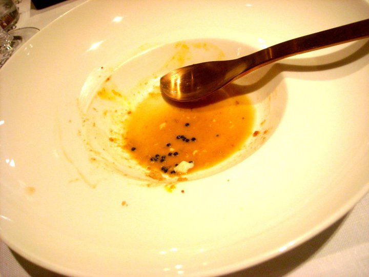 Ssszz… un uovo, altre uova e una nonna toscana, un racconto rituale in senso orario che inizia con ritagli di petto di gallina, prosegue morbido in una quenelle di fegato grasso, si spande a ritmo lento in un uovo poché che si scamicia, denso, per ringalluzzirsi nel gusto eccitante del caviale, per poi disperdersi nella tranquilla croccantezza di mozzichi di pane casereccio ritemprato in un brodo ristretto perfetto, ambrato, tiepido e ricco. Oro su oro antico (qui mettete voi la virgola a seconda che vogliate dipingere o ricordare).