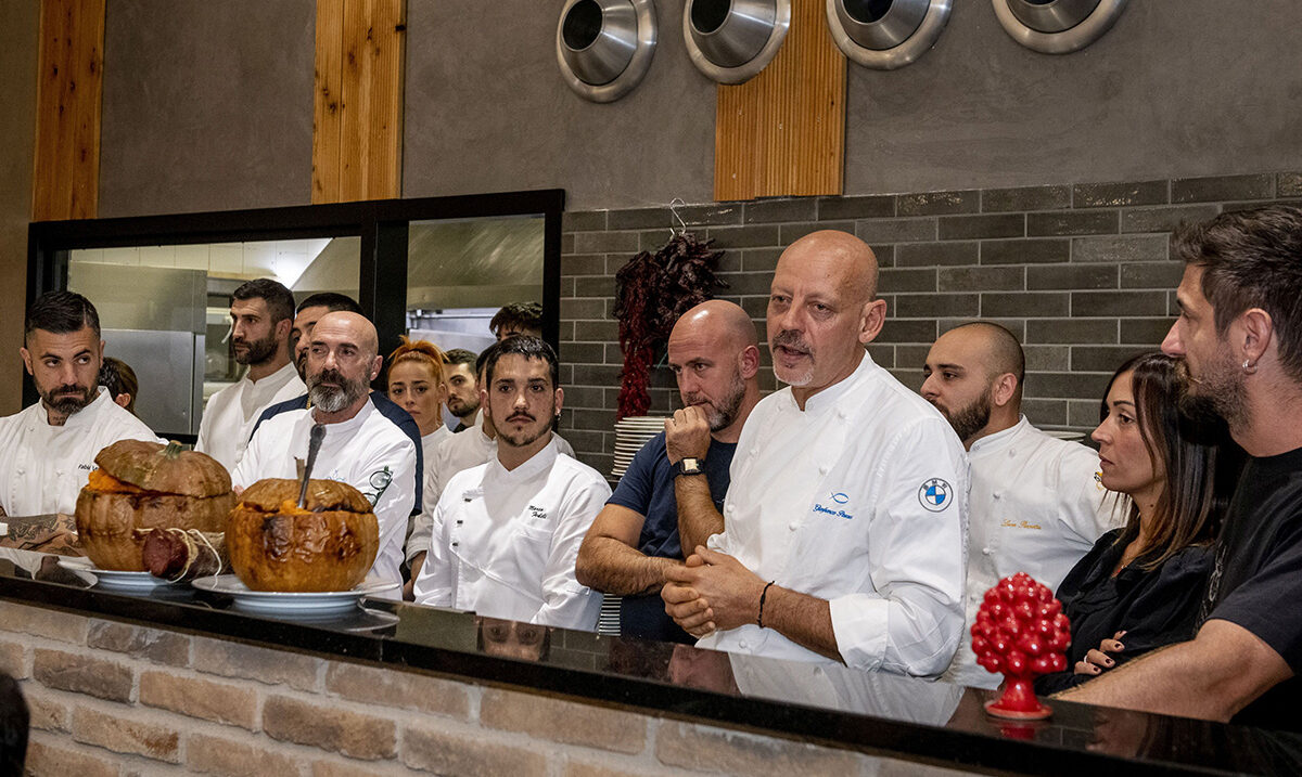 Fuori menu gli arrosticini di lampuga, frollata 5 giorni, marinati e cotti alla brace e il crostone di pane cafone di Lele Usai arricchito di crema di zucca locale e ‘nduja di alalunga. In abbinamento il Franciacorta DOCG Brut dell’azienda La Fiòca, da uve Chardonnay e Pinot Nero.