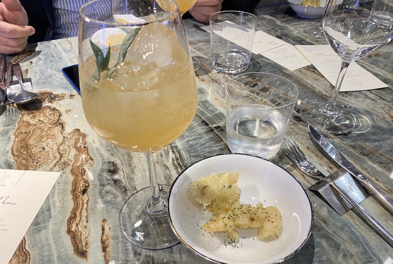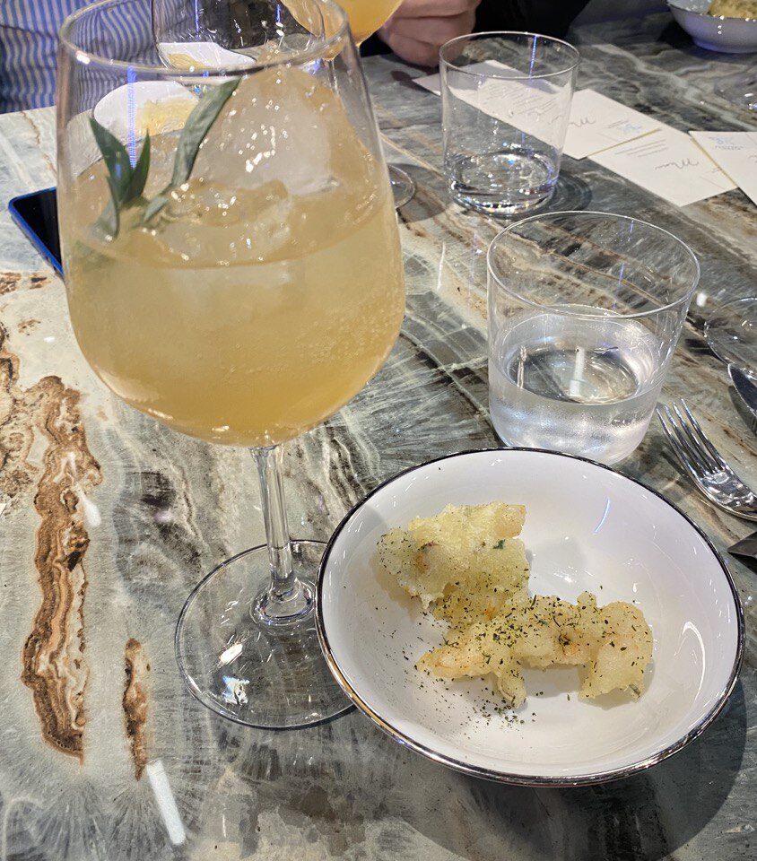 – Frittella di gamberi rosa locali, abbinata allo Spritz Iodato (vol. 7%), con Vermouth aromatizzato alle foglie di fico, genziana, marmellata di gamberi, prosecco, soda, liquore al fico e guarnizione di finocchio marino