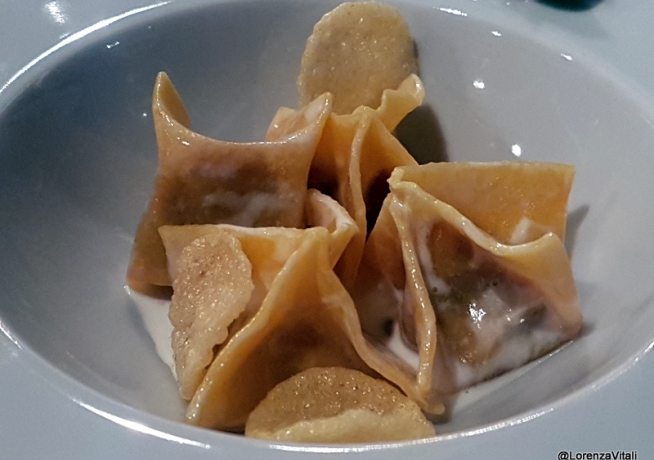 L’antipasto è un omaggio alla cucina italiana: Seppie e piselli..brodo ristretto, molto pepato, dal tocco orientale. Arrivano i ravioli con spuntature, polenta e cacao: un primo con un ripieno deciso e gustoso di spuntature cotte nel sugo e una salsa esterna di pecorino delicatissima, un velluto, che contrasta con la polenta croccante e il sapore deciso del gel di cacao che decora il piatto. La proposta dello chef è un tuffo indietro nel passato, alla spianatoia di legno posta al centro della tavola con la polenta e le spuntature di maiale: un’immagine che non ha età.