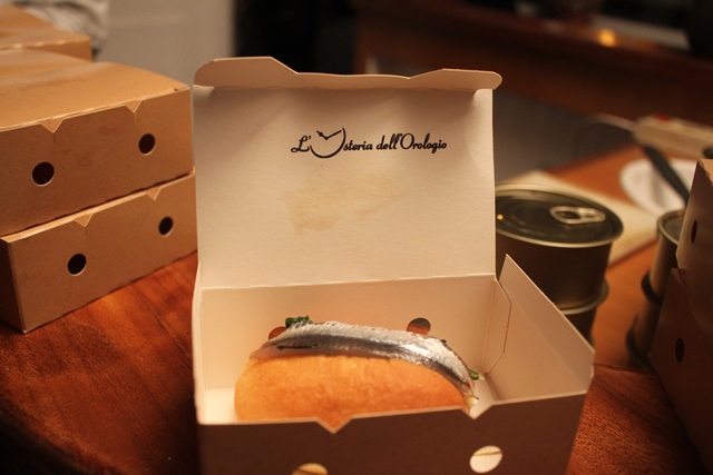 E ancora un salmone da viaggio, servito in una scatoletta: salmone, verdure biologiche di Maccarese in osmosi, senape e crème fraiche e la pasta fredda a Parigi: fusillone “Gentile” con fondo bruno di gamberi, crema di sedano rapa, ghiacciata di foie gras e gambero rosso. Conclude l’aperitivo una zuppa inglese rivisitata della Pasticceria Patrizi.