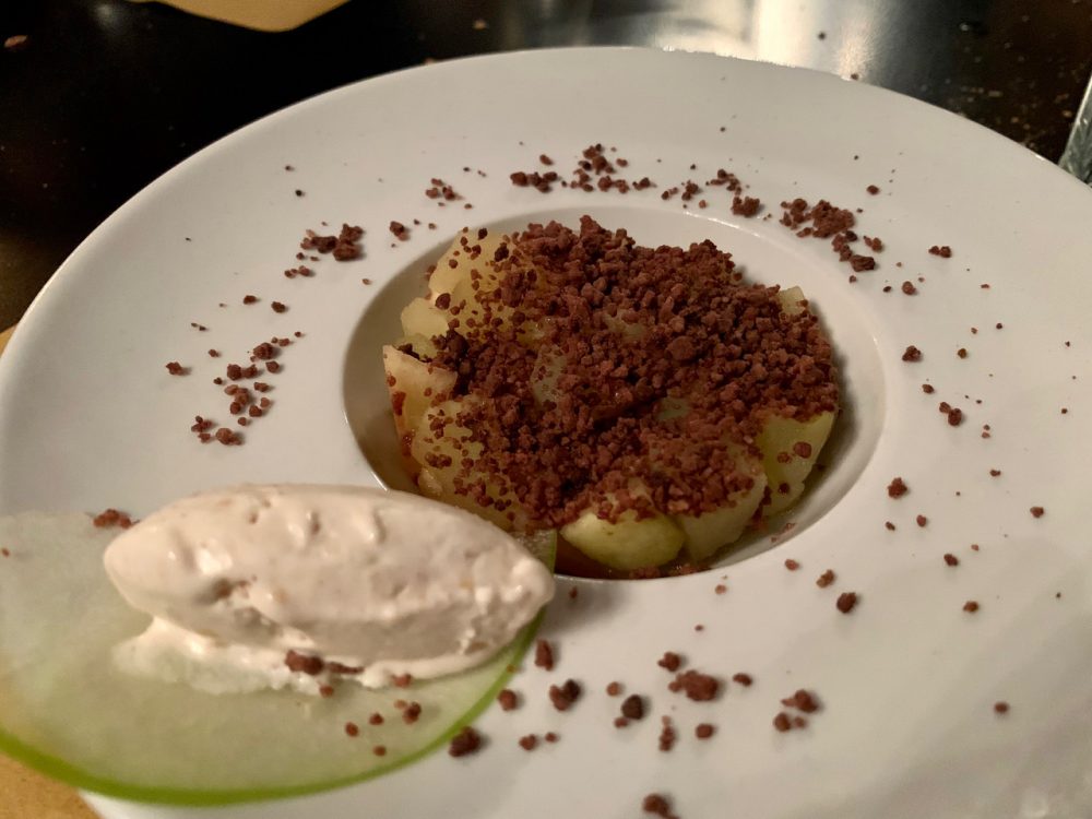 Come dolce c’è il crumble di mele: servito con un gelato di soia e mela per un contrasto di temperature, è godurioso senza appesantire il finale di pasto.