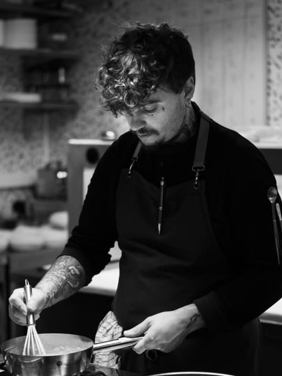 Per questa ricetta, Luigi è partito dal formato di pasta: le candele. Questo formato, infatti, gli ricorda un piatto che sua nonna gli cucinava spesso, la pasta alla genovese, tradizionalmente cotta al forno. Luigi ha voluto quindi renderle omaggio reinterpretando la ricetta in chiave moderna, sostituendo la cottura al forno con una cottura alla brace e adottando un metodo innovativo per la preparazione della pasta, optando per una reidratazione a freddo al posto della cottura tradizionale.