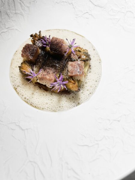 In una padella, sigillare la guancia di maiale, rosolandola su tutti i lati fino a quando non si sarà formata una crosticina dorata, dopodiché aggiungere le cipolle bianche – precedentemente tritate – e lasciar rosolare per 10 minuti. Sfumare con il vino bianco e lasciar evaporare, aggiungere il mazzetto aromatico e coprire, quindi cuocere a fuoco basso per altre 4/6 ore. Mescolare e aggiungere un po’ di acqua o brodo, se necessario. Una volta cotta, lasciar riposare la guancia di maiale con una parte del suo liquido di cottura per 24 ore in frigorifero. Dopo il riposo, montare il composto in una planetaria con il grasso di anguilla fino ad ottenere una consistenza cremosa.