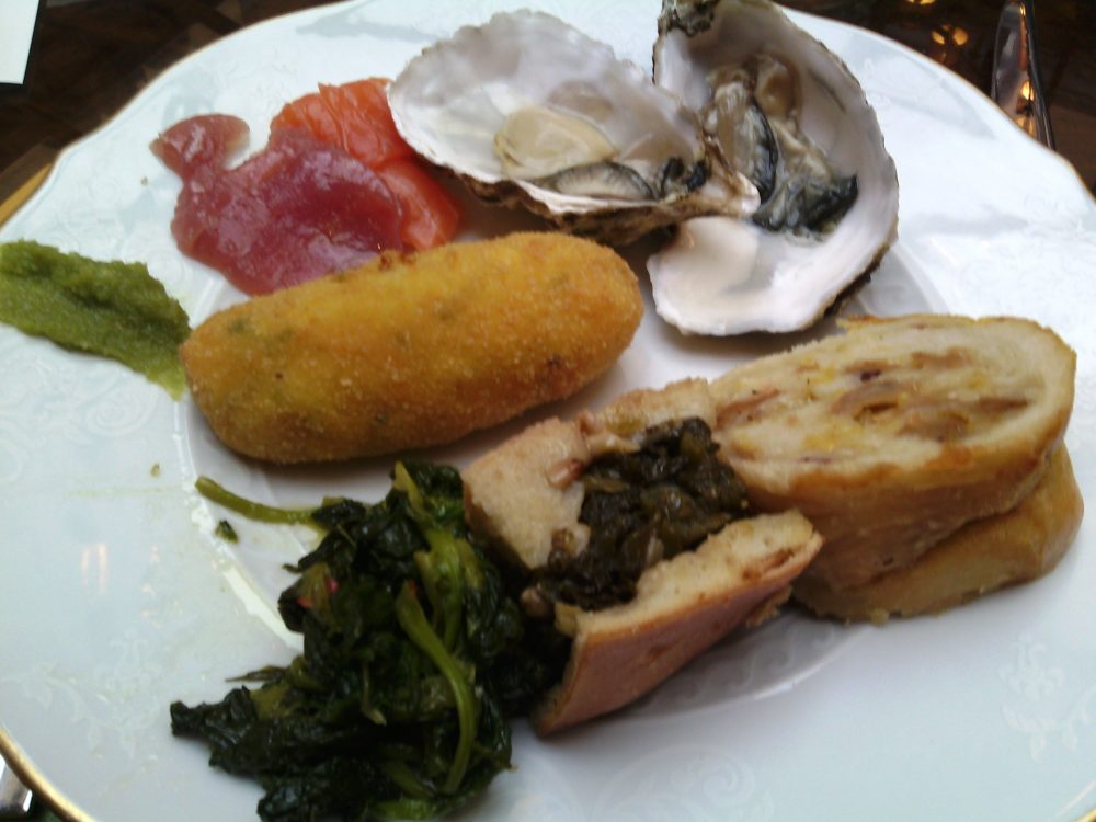 Four Seasons, il piatto con i crudi di pesce, gli antipasti caldi e i piatti campani – crocche’, casatiello, pizza di scarola, friarielli, ostriche, crudo di salmone e di tonno, ostriche