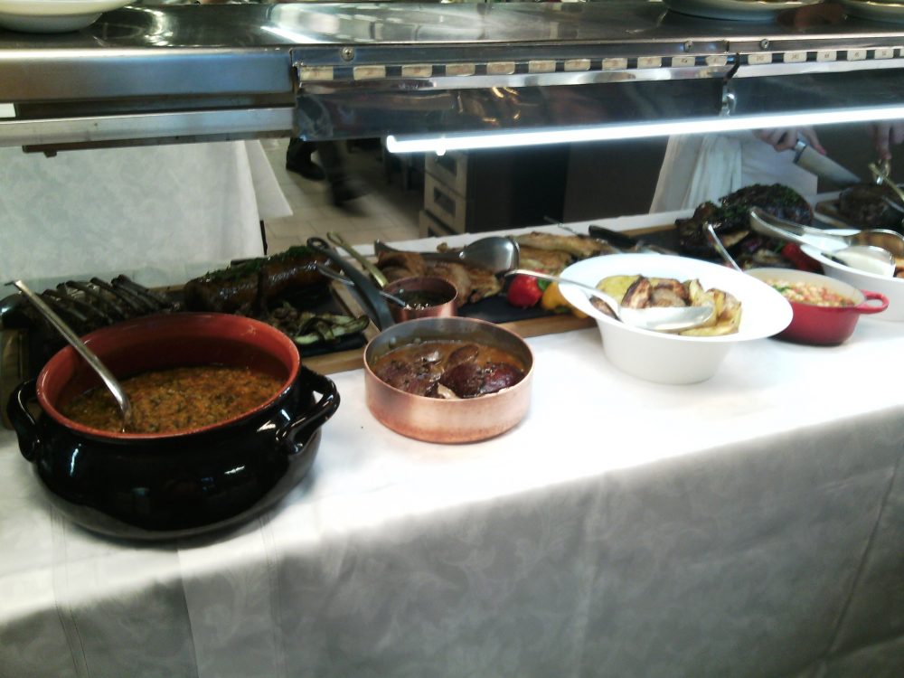Si inizia dalla fine: il sublime banco dei dolci, sul quale stanno ordinati decine di monoporzioni moderne, dolci al bicchiere, creazioni a base di frutta fresca. Poco oltre vengono serviti i pancake, realizzati al momento, con salse di accompagnamento, e tre tipi di torte moderne diverse, due entremet e un dorato lingotto al tiramisù.