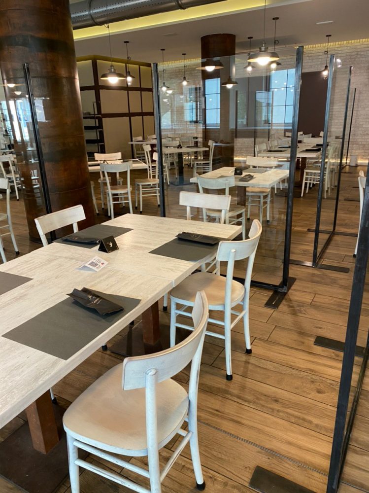 Inimmaginabile che l’adeguamento alle misure di sicurezza potesse migliorare l’aspetto della sala che già prima lasciava lo sguardo addolcirsi nei dettagli delle pareti. Troviamo infatti degli eleganti separatori in vetro e ferro che riprendono il tema della “gabbia”, la struttura che racchiude il banco di lavoro e la cucina offrendola allo sguardo degli ospiti.