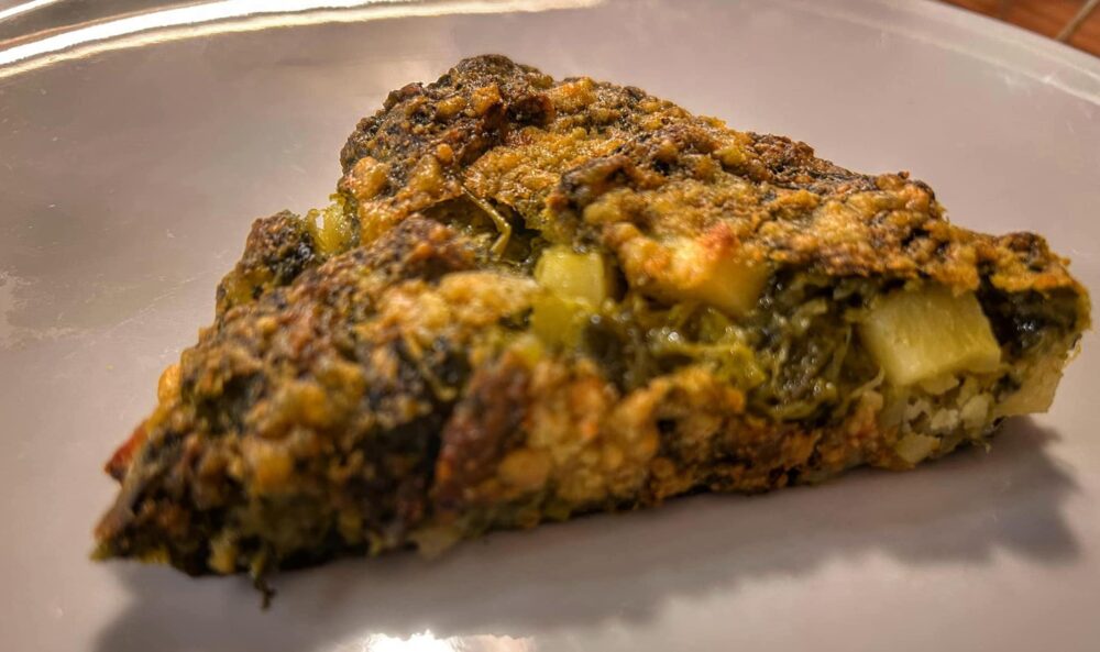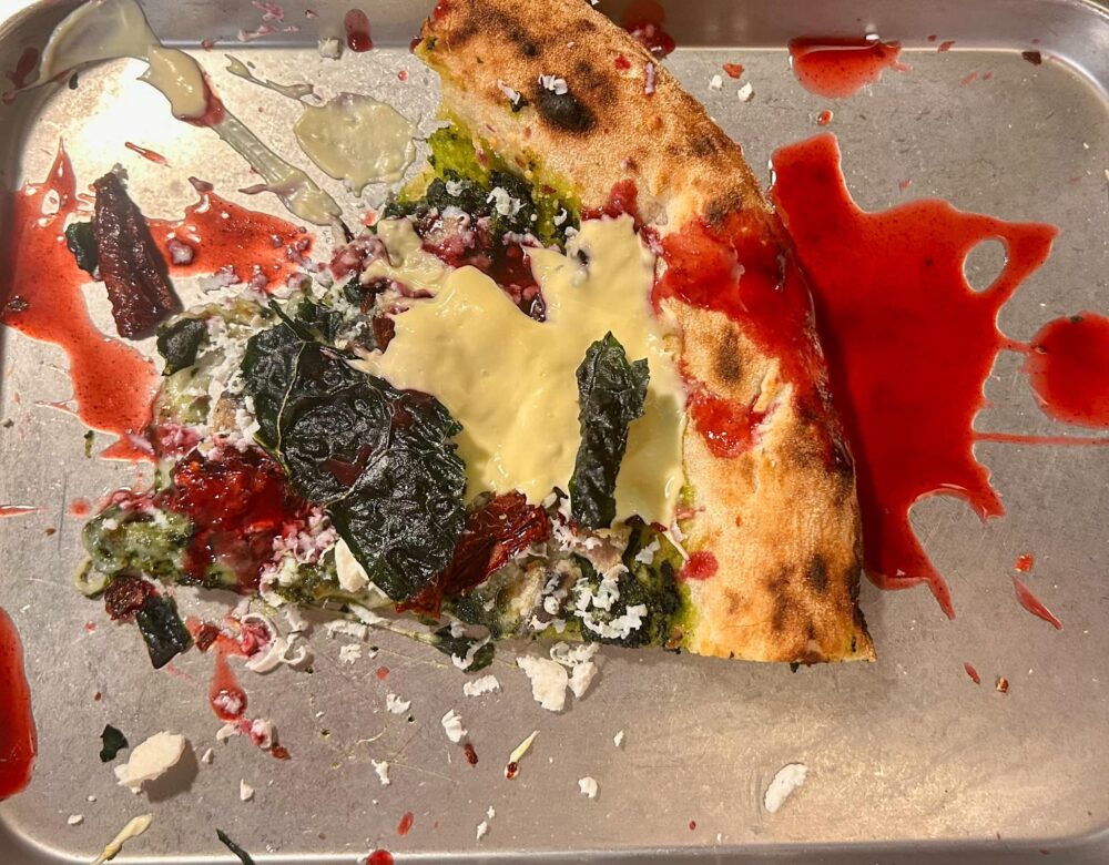 - Cicoria saltata, crema acida di bufala, al te matcha, e riccio di mare. Che sapore ha l’amaro? Anzi che sapore ha una scala di amari, supportati dalle note sapide, su una pizza? Ho avuto la mia risposta, hanno il sapore di questa pizza.