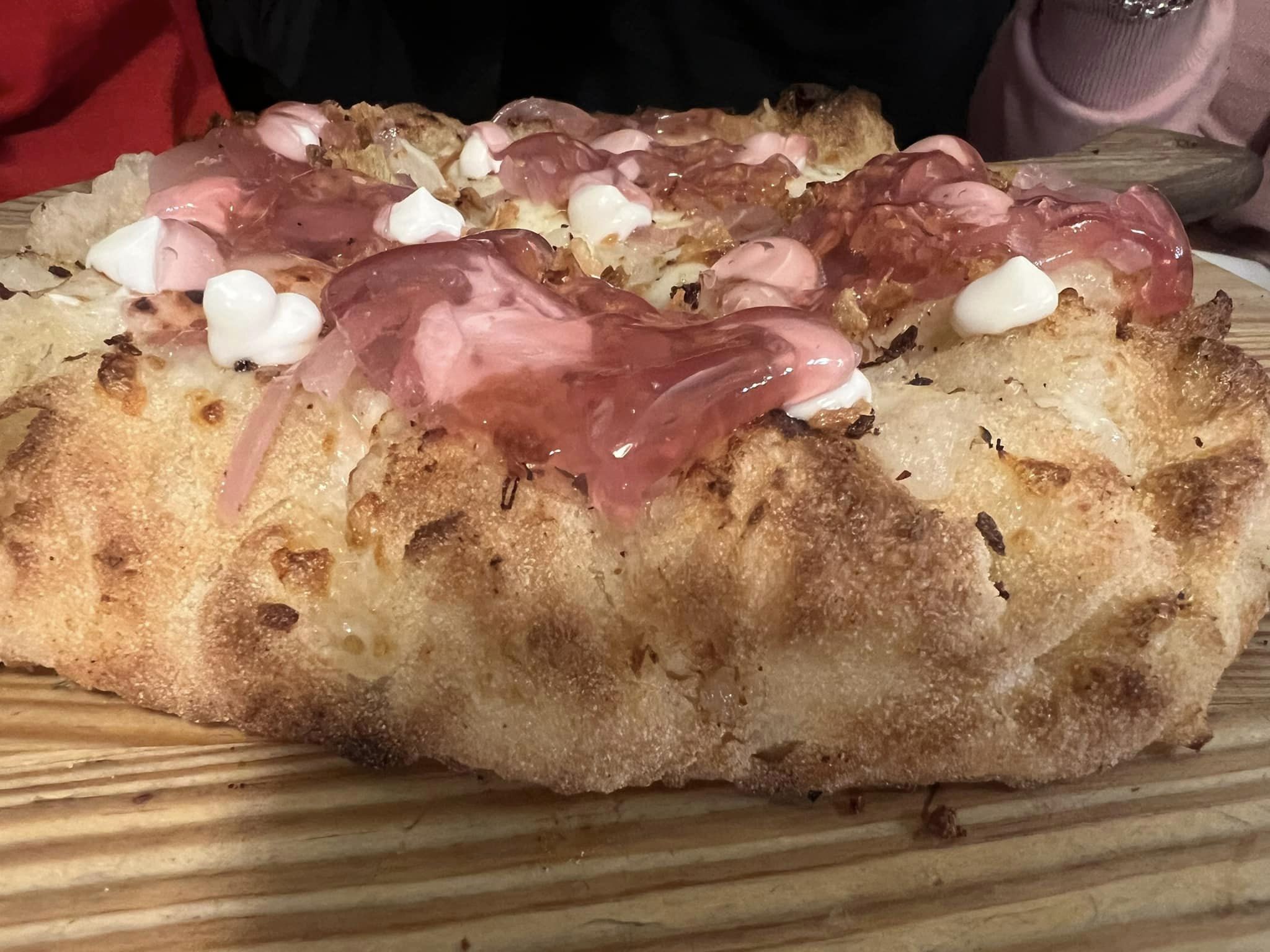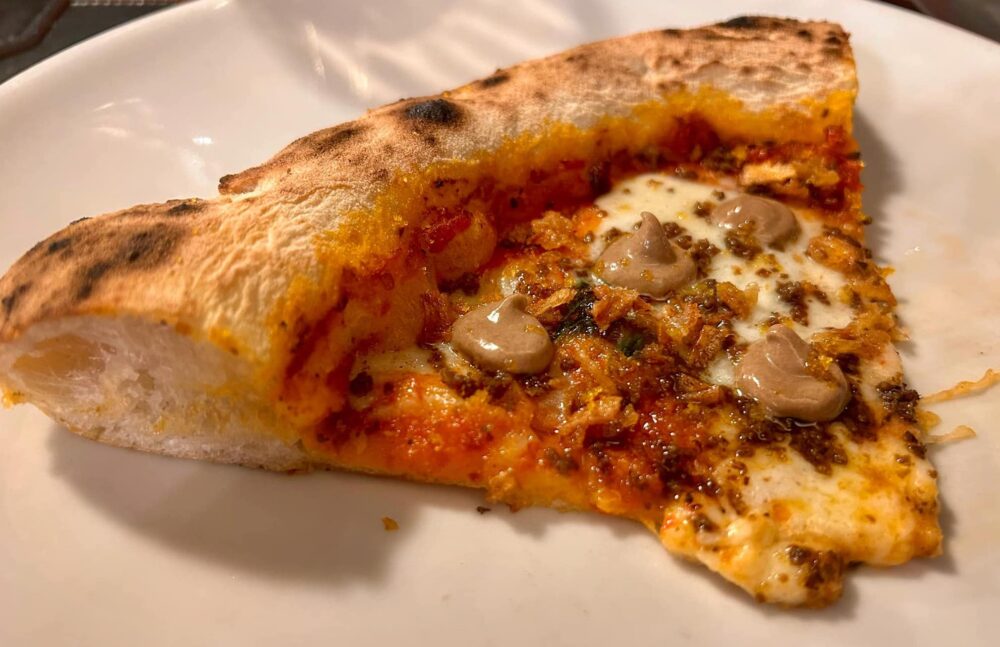 La golosità vera è la pizza che fa il verso al vitello tonnato, addirittura un miglioramento rispetto alla ricetta tradizionale piemontese grazie all’uso sapiente della cipolla e del limone che rinfresca il morso, fa salivare e ripulisce il palato.