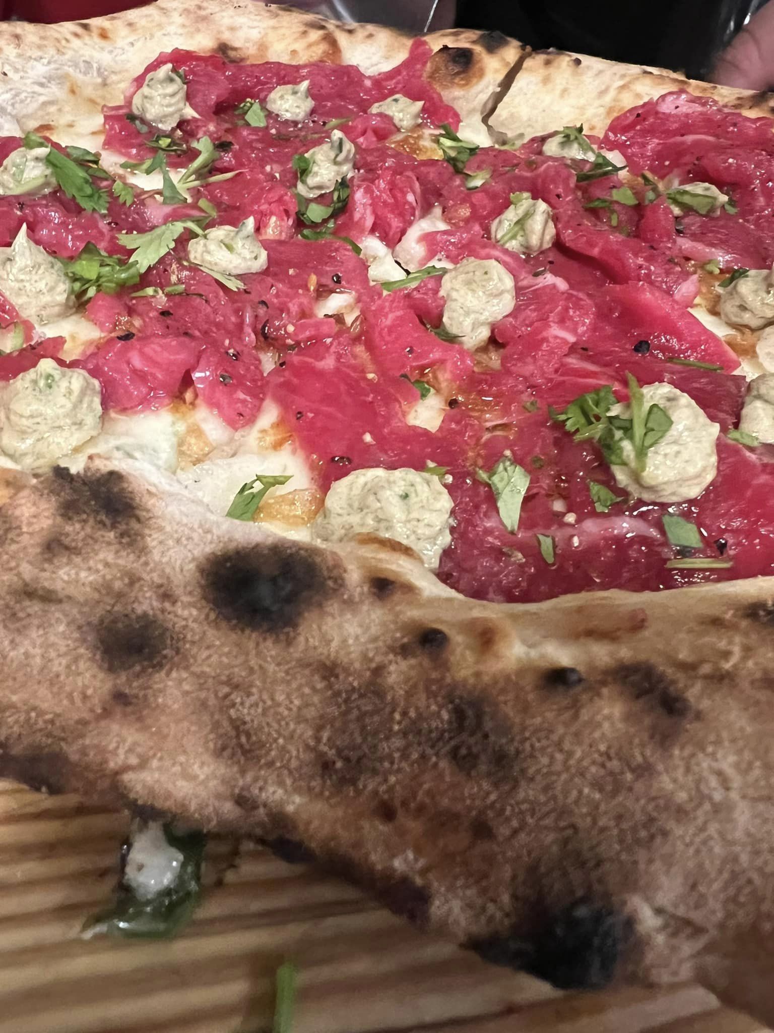 - Carne alla pizzaiola, pomodori in varie consistenze, ragù, wagyu di Hokkaido, origano, aglio. La tradizione campana della carne alla pizzaiola si contamina con la cultura giapponese. Il pregiato wagyu di Hokkaido non viene cotto con nel pomodoro ma sono scottato a parte con il cannello per non perdere la succulenza. Una pizza senza olio che gioca sul grasso rilasciato dalla carne stessa. Pensieri raffinati.
