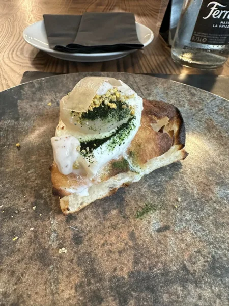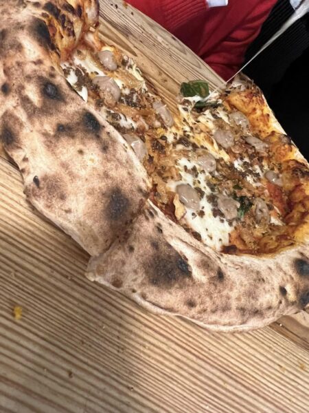 Un menu degustazione in pizzeria non è il giro pizza. Per proporre un menu degustazione, ci deve essere un fil rouge che collega tutti gli assaggi, un percorso studiato e non solo far provare uno spicchio di pizza tra le pizze che hai in carta. La cosa che mi ha sorpreso più di tutto è proprio questo aspetto, il senso complessivo degli assaggi, la varietà delle sensazioni palatali e soprattutto la centralità dell’impasto, anzi la centralità degli impasti, perché se gli impasti passano in secondo piano non sei pizzaiolo. Il menu costa 70 euro e li vale tutti, ma potrete anche spendere solo 7 euro per la classica e deliziosa Margherita, nella migliore pizzeria del mondo da 5 anni di fila.