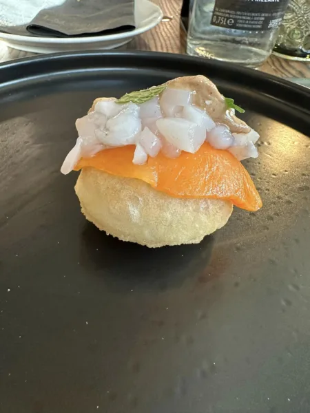 - Montanarina con zucca marinata, tartare di seppie, burro di anacardi, menta. Il boccone che serve a rinfrescare ed a chiudere il percorso.