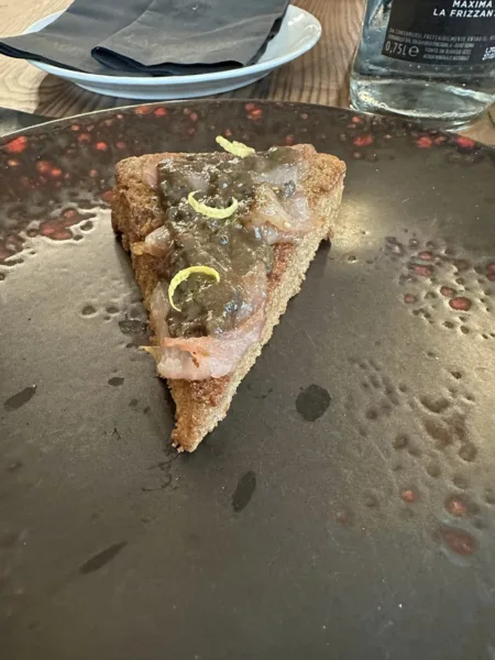 Per chi ama la cipolla come me è l’apoteosi, il miglior modo di mangiarla mai visto in precedenza, freschezza e terrosità, rimandi fume’ e diverse consistenze, uno studio della materia prima prodotta dalla vicina Alife, grande centro contadino casertano famoso appunto per questo tubero. In questa proposta vegana non ci sono proteine animali ma niente le fa rimpiangere, tanto il gusto è pieno e moderno. Dal sapore confortevole e rassicurante delle diverse zuppe che girano per l’Europa, a una interpretazione moderna che a prima vista potrebbe peccare di manierismo per il numero di modalità in cui la cipolla è proposta ma che, fatto il morso che le comprende tutte e sette, ha una sua logica simile a quella della pizza dedicata a Bottura.