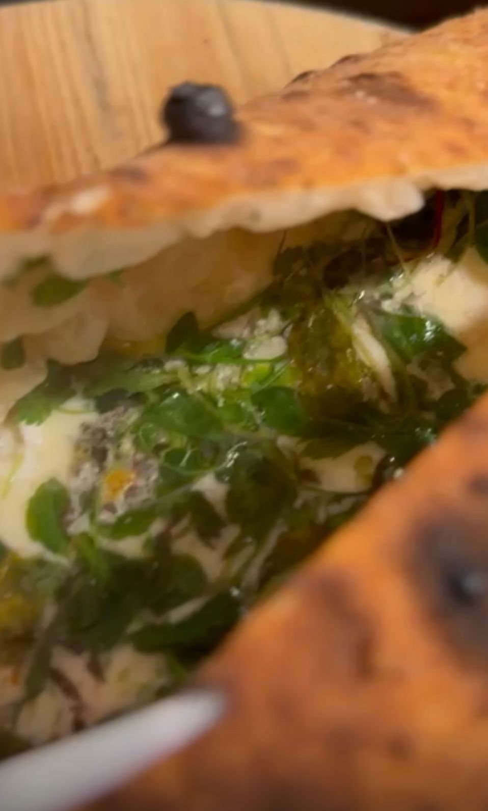Terzo step, il ripieno di erbe spontanee cotte al forno, mousse di ricotta di bufala ed erborinato. Una versione moderna sul calzone al forno su cui nessuno sta ragionando perché fermi sulle pizze, a parte Franco Gallifuoco con le sue Grotte