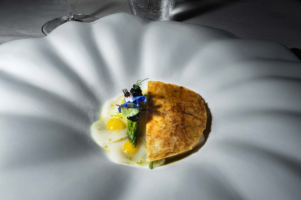Esperimenti riusciti sono anche la Capasanta, con asparago e pelle di pollo croccante dal gioco delicatissimo tra marinatura e cotture e il Branzino su crema di limone e zucchine, con salsa olandese e polvere al nero.