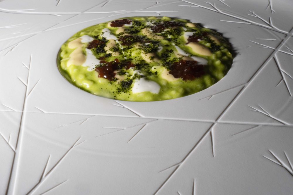 Franco Mare, Risotto, salsa vongole, caviale d’acciuga e polvere di cima di rape