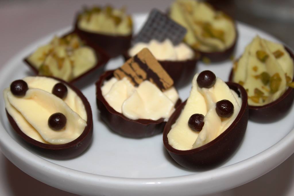 Cremoso alla liquirizia, rocce di cioccolato soffiato all'olio d'oliva, pralinato alla nocciola e gelato di menta.