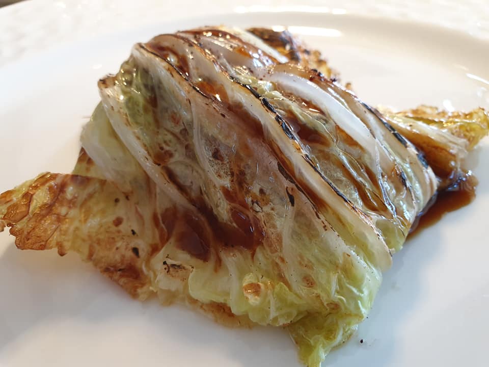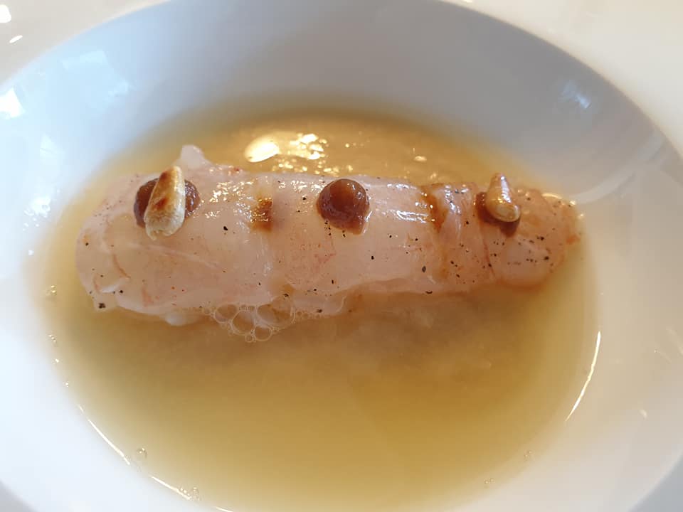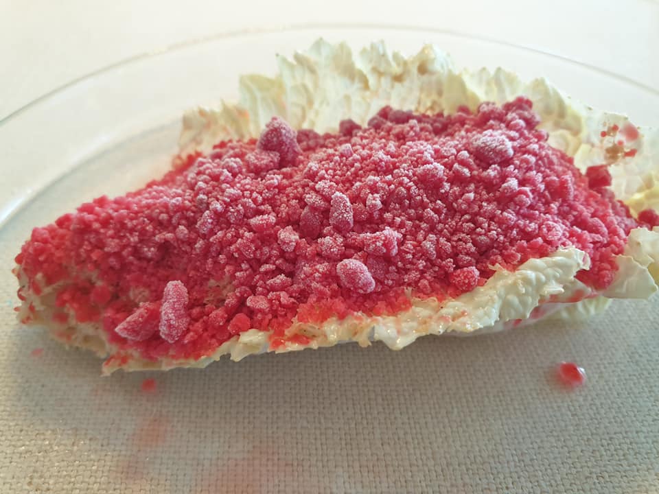 Il piatto del viaggio è “Accidia”. Accidia: insalata Iceberg, crema al limone, riduzione di birra e polvere di Kafa. L’insalata è usata posto del millefoglie. La consistenza, le note fresche, ne fanno uno dei dolci da ristorazione più interessanti mai provati. Invidia: foglia di indivia belga, crema di liquirizia, capperi, limone e granita di frutti azotata. Due morsi per un altro piccolo capolavoro.