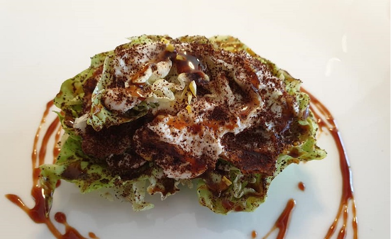 Il piatto del viaggio è “Accidia”. Accidia: insalata Iceberg, crema al limone, riduzione di birra e polvere di Kafa. L’insalata è usata posto del millefoglie. La consistenza, le note fresche, ne fanno uno dei dolci da ristorazione più interessanti mai provati. Invidia: foglia di indivia belga, crema di liquirizia, capperi, limone e granita di frutti azotata. Due morsi per un altro piccolo capolavoro.