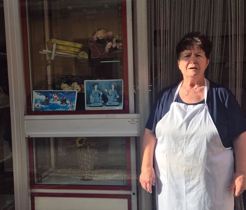 La signora Maria , “in Scairato” ci tiene a dirmi , ha addobbato la vetrina del suo panificio con le figure dei Santi Cosma e Damiano. Dentro trovi pane fresco, pizza in teglia e freselle dall’odore assolutamente travolgente.
