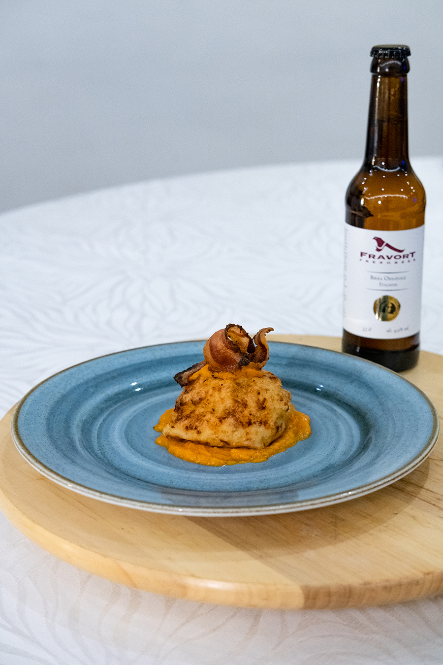 La ricetta è ispirata all’autunno, alla sua freschezza e alle sue sfumature di colore. In essa, la dolce morbidezza della zucca contrasta la sapidità croccante del guanciale. In abbinamento una Fresh Beer chiara, che richiama la freschezza della preparazione.