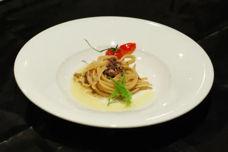 In una padella versare l’olio extravergine, portare a temperatura ed aggiungere lo spicchio d’aglio, un po’ di peperoncino trinciato e gli occhi di totano.