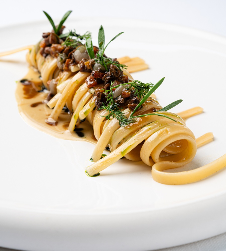 Disporre la pasta al centro del piatto creando la forma di un nido. Aggiungere il ragù di padellaccia, il gel di olive e l’olio al finocchietto. Ultimare il piatto decorando con finocchietto fresco e finocchio di mare.