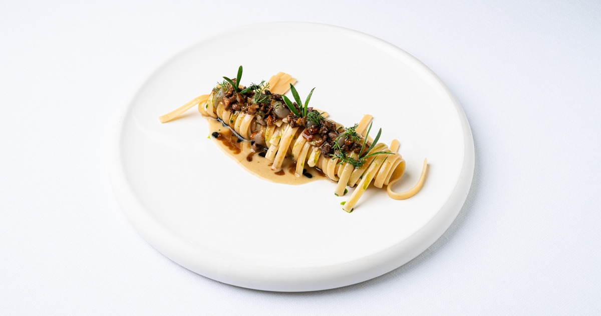 Disporre la pasta al centro del piatto creando la forma di un nido. Aggiungere il ragù di padellaccia, il gel di olive e l’olio al finocchietto. Ultimare il piatto decorando con finocchietto fresco e finocchio di mare.