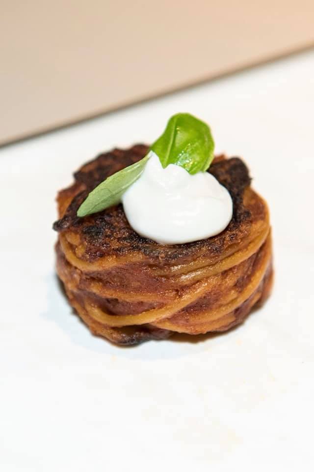 Ragù napoletano di Lino Scarallo. Dalla pagnotta ripiena di ragù della prima edizione ad una elegante versione in versione finger che ci costringe ad una presa continua e compulsiva dai vassoi che girano dopo la presentazione di Ragù 7su7 svolta a Palazzo Petrucci.