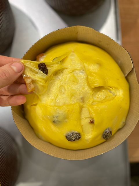 La farina è quella del Molino Pasini (una 0 non macinata a pietra per ottenere un maggior controllo sulla lievitazione), il burro è di Fattorie Fiandino, le uova sono di Conca Verde Bio e vengono sgusciate a mano, i canditi Morandin, i mieli Thun (Sulla), sui cui viene grattugiata l’arancia di Raccolto&Mangiato, (Palagonia, CT), unico aroma presente nel panettone, che crea un profumo intenso. Impossibile non citare il lievito madre: Thomas, omaggio a Thomas Piras di Contraste.