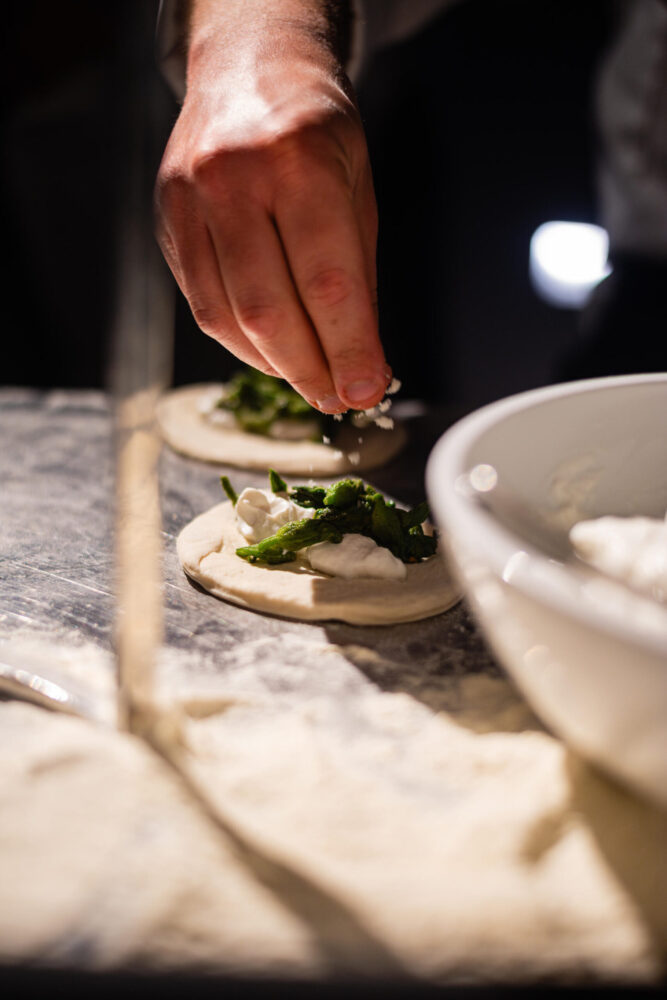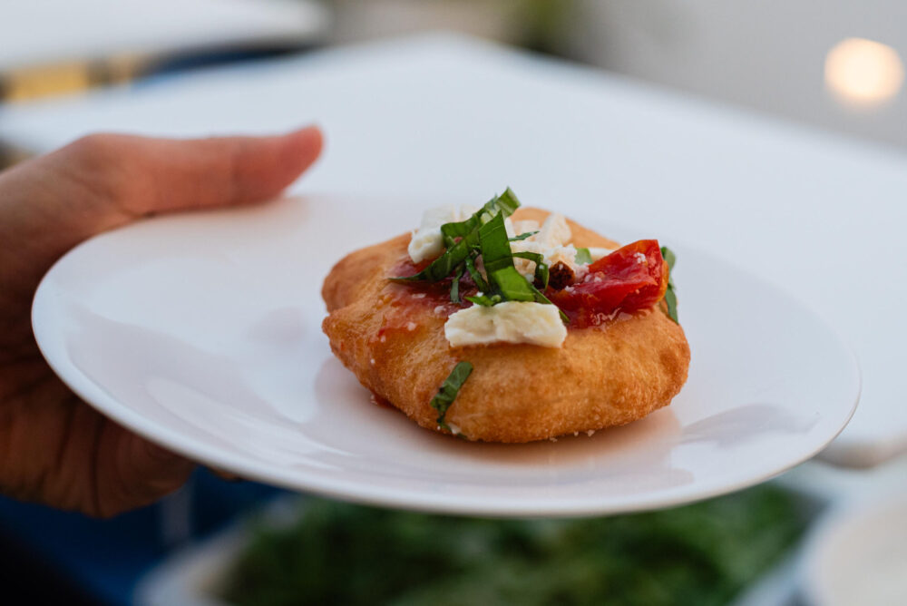 Accanto a loro, lo chef resident del Macpherson’s, Umberto Zimbaldi, ha firmato una delle creazioni più riuscite della serata, la montanarina con ragù di polpo, intensa e mediterranea, seguita da un calzoncino fritto con ricotta e fiori di zucca, da un croccante di mozzarella affumicata ripiena alla parmigiana, da una montanara classica con provola, piennolo e basilico, e da un primo piatto generoso e avvolgente, il tubetto di Gragnano con fagioli spollichini e basilico.