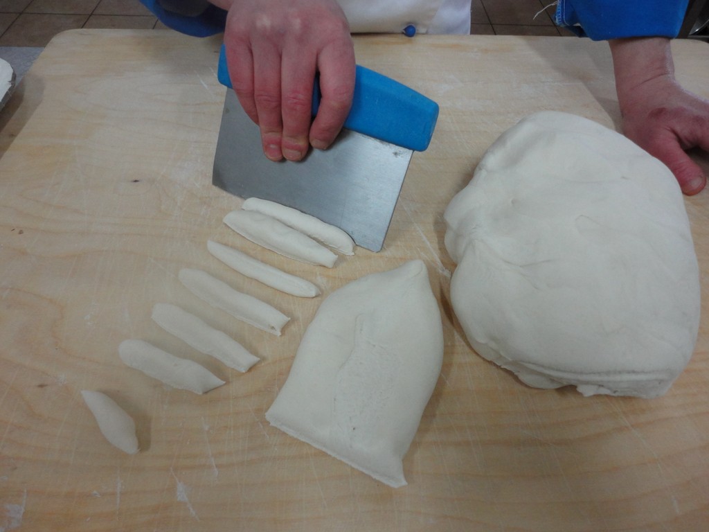 I rotolini di pasta: Quindi prendere delle piccole porzioni di pasta e formare dei rotolini lunghi circa 10/12 cm e sottili (il doppio del ferro che userete per modellare il fusillo,in alternativa si può utilizzzare uno stecchino da spiedino in legno).