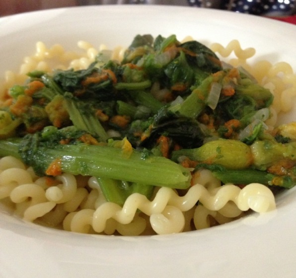 Mettere in una padella la cipolla e far soffriggere a fuoco bassissimo. Contemporaneamente lessare le cime per 4 minuti e poi raffreddarle sotto l'acqua corrente e tagliarle a pezzetti grossolani. Cuocere i fusilli.
