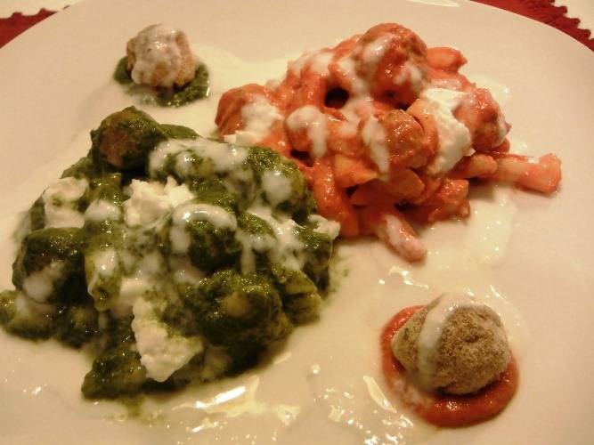 Impiattate i due tipi di fusilli decorando con la crema di bufala e qualche polpettina sparsa per decoro!