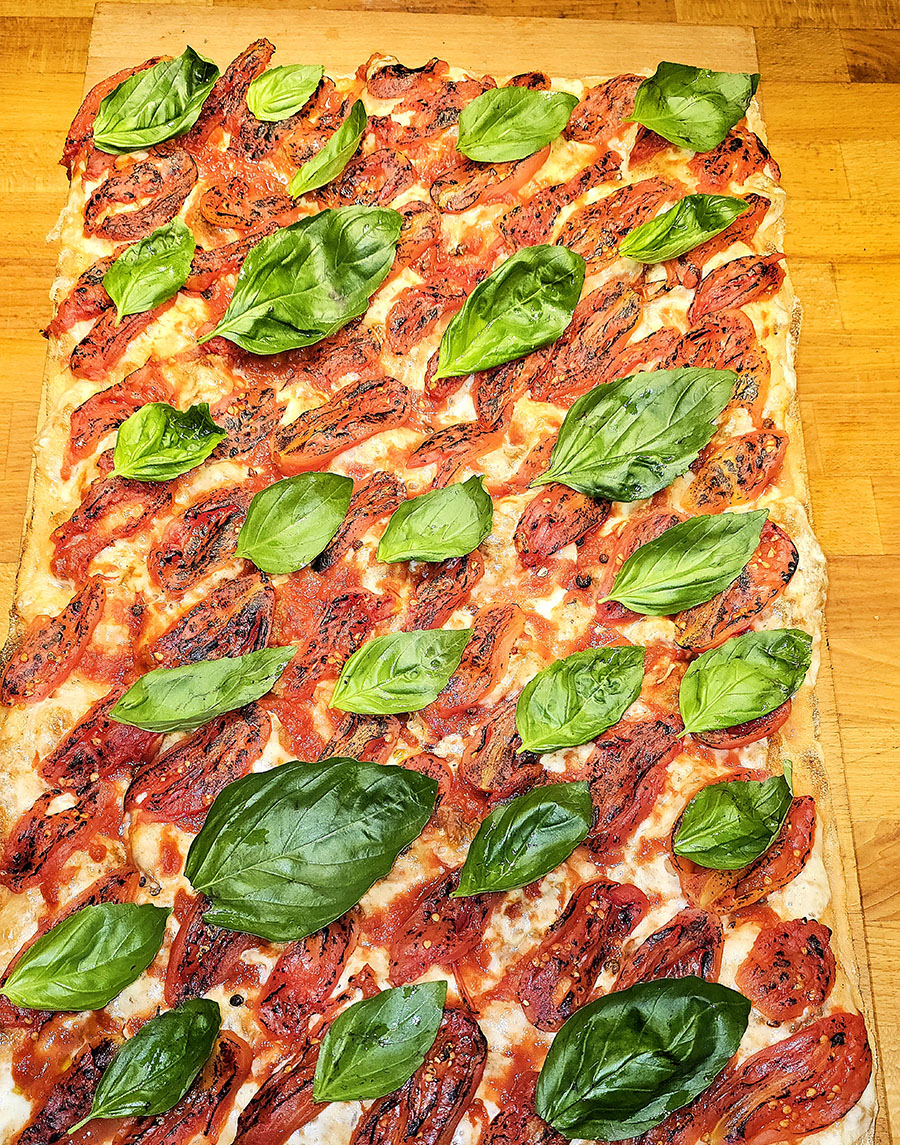 Coprire tutta la base della pizza con la provola affumicata, per poi disporvi sopra il pomodoro Siccagno alla brace. Concludere con il sale Maldon, il pepe di Sichuan, basilico e un filo di olio extravergine di oliva.