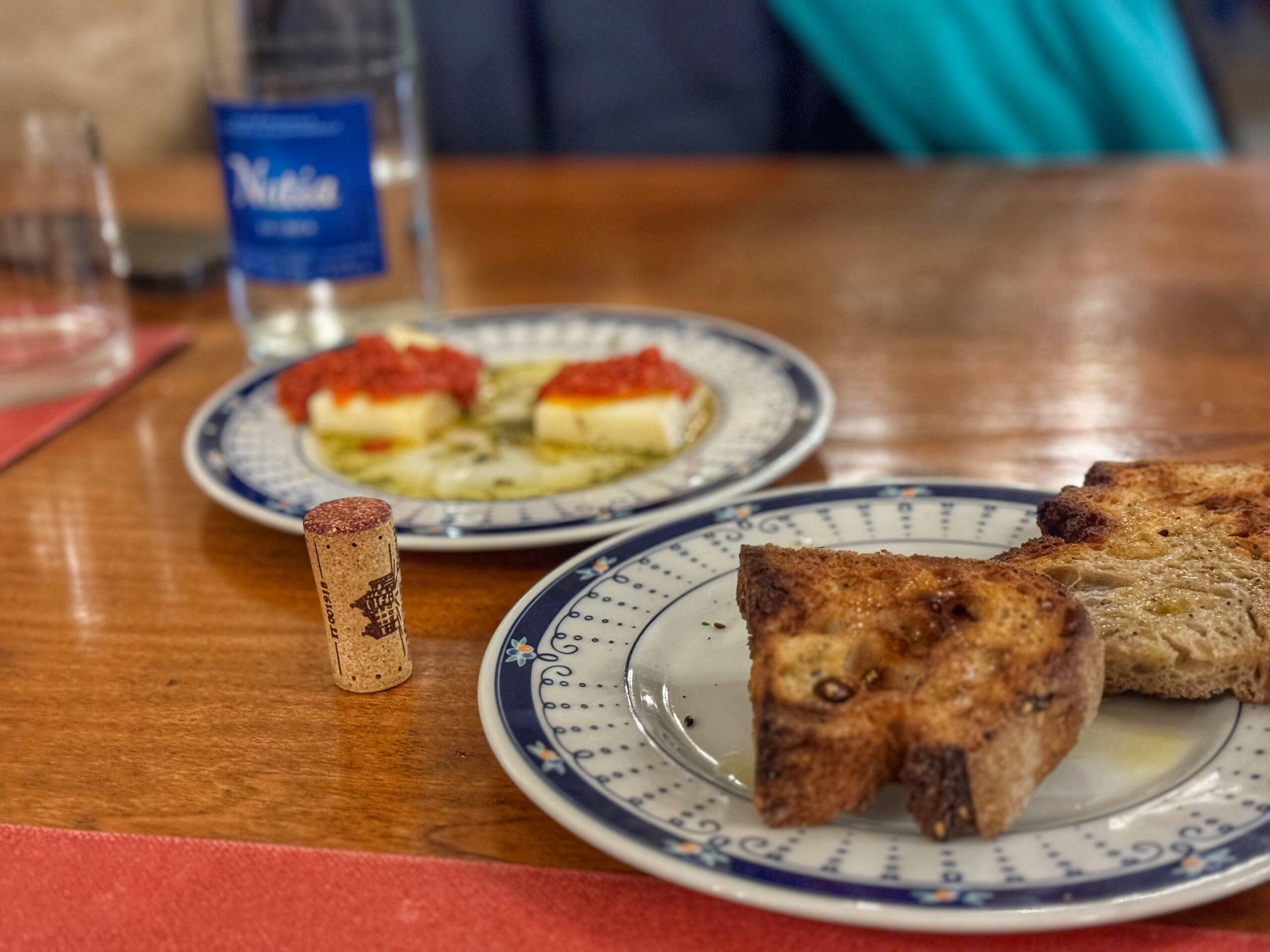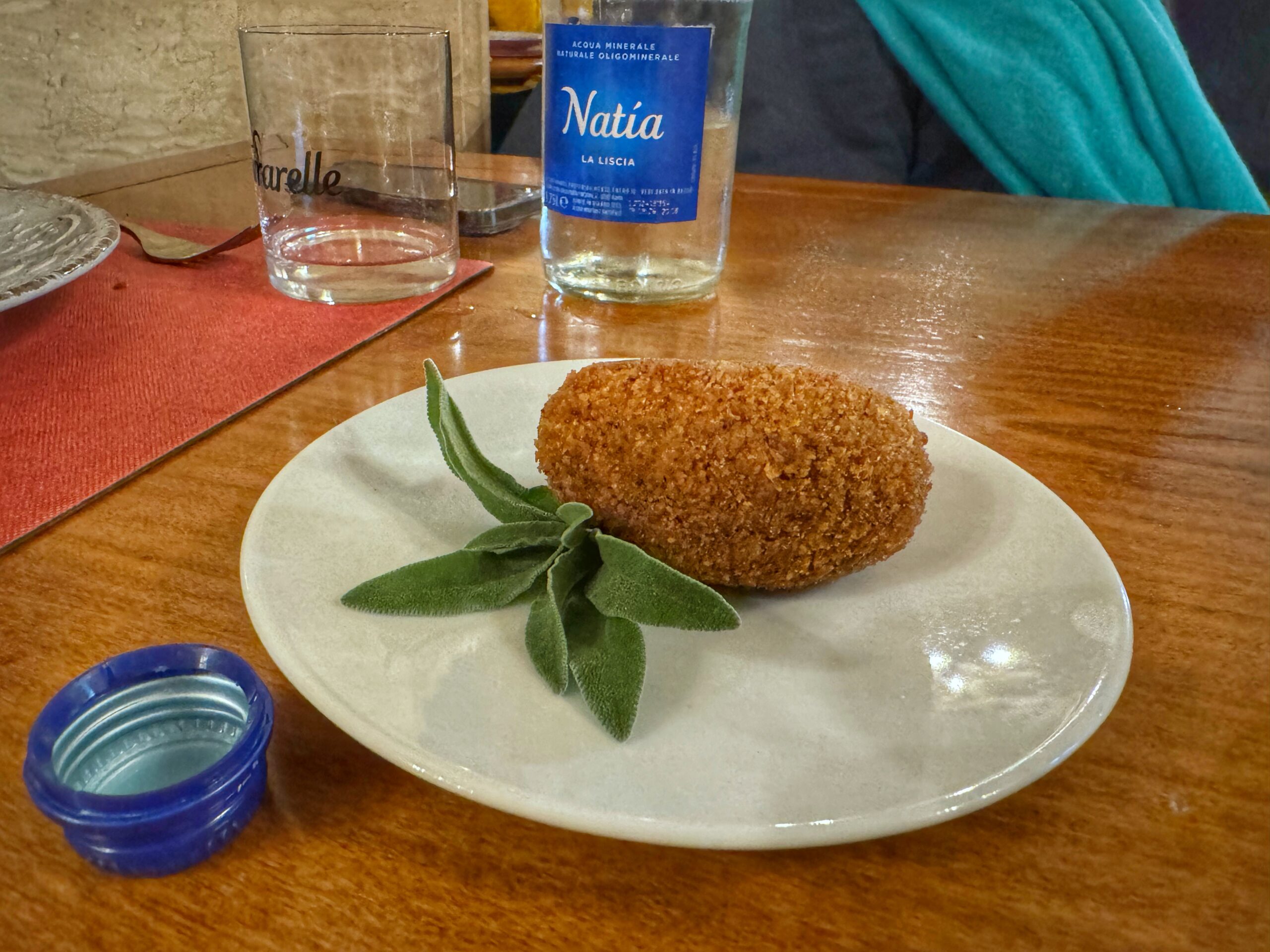La serata si è aperta con un omaggio al territorio: pane ai semi, caciocavallo morbido riscaldato, pomodoro e origano di montagna. Un inizio semplice ma perfettamente equilibrato, un assaggio che ha subito conquistato. Poi il supplì firmato Bonci: croccante, filante, con un cuore rosso vivo che rende omaggio alla tradizione romana.