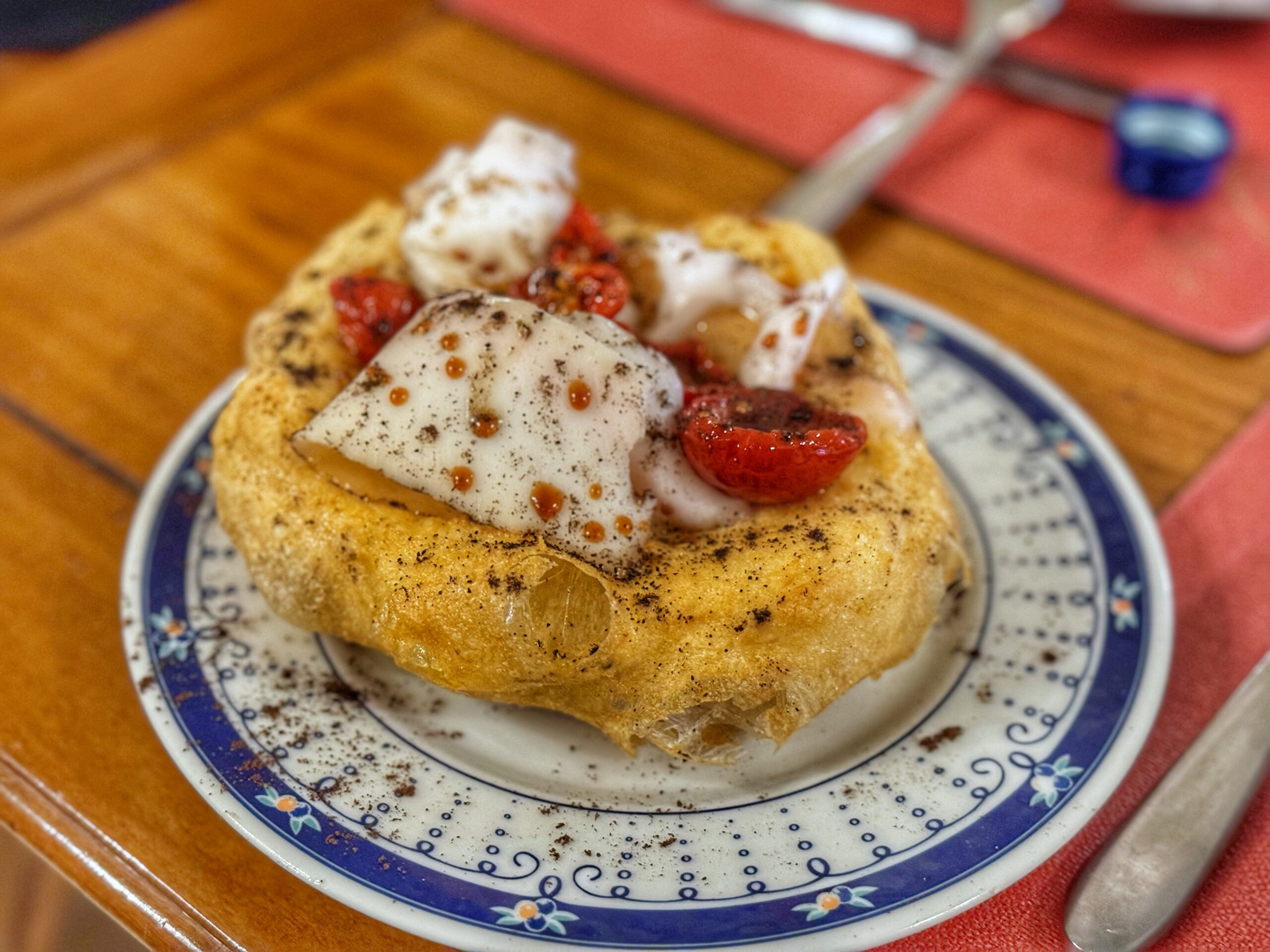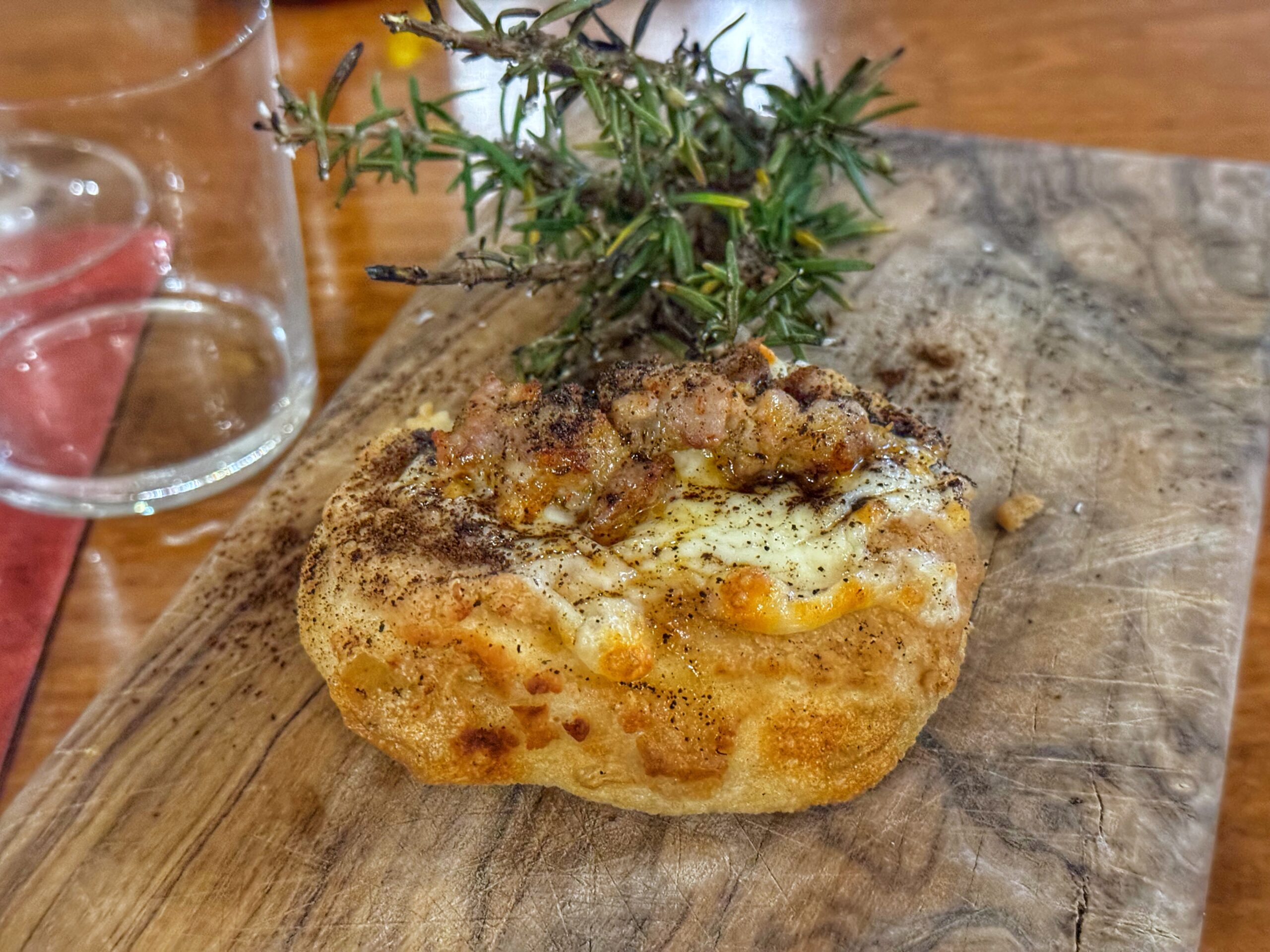 Poi è stata la volta della pizza fritta: una proposta con pignata di fagioli, salsiccia, polvere di caffè e rosmarino affumicato, e un’altra variante con lardo stagionato, pomodori semidry e vino cotto. Un trionfo di sapori, ogni piatto accompagnato da lievitati impeccabili.