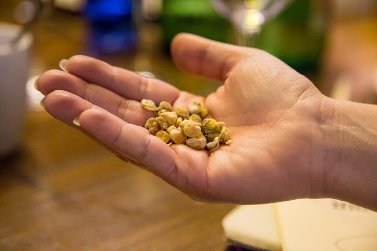 Ho con me da dargli un sacchetto di Cicerchia dei Campi Flegrei, legume frutto della terra da cui provengo.
