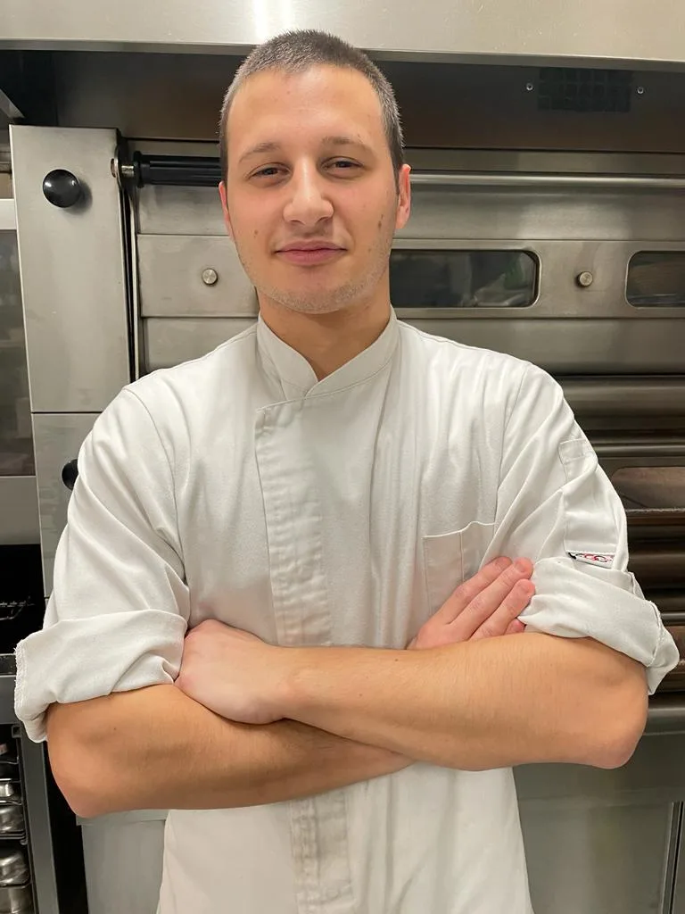 L’idea di questa ricetta nasce da un ricordo d’infanzia di Davide, quando sua nonna, durante le domeniche invernali, preparava la gallina in brodo, sempre accompagnata da verdura colta direttamente dall’orto di famiglia. Da qui il desiderio di riproporla sulla sua pizza, in abbinamento alla provola affumicata di Latteria Sorrentina, alla bietola di Bassano, alla cipolla rossa di Chioggia e ad un topping di melograno e lamponi.
