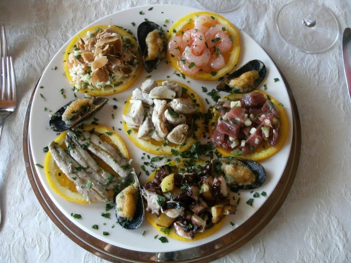 S’incomincia subito con un ricco e sostanzioso antipasto di mare fatto di tante sfiziosità: cruditè di gamberi e di tonno; insalata di riso con gamberi, menta e mandorle; alici marinate; cozze al gratin; polpo all’insalata con spicchi di patate; e altro pesce ancora, servito il tutto su fettine di arancia. Solo questo sublime piatto poteva bastare a saziare la nostra fame. Ma bisognava andare avanti per forza e, quindi, sotto con le altre portate. Secondo antipasto: ostriche imperiali crude del golfo di Gallipoli.