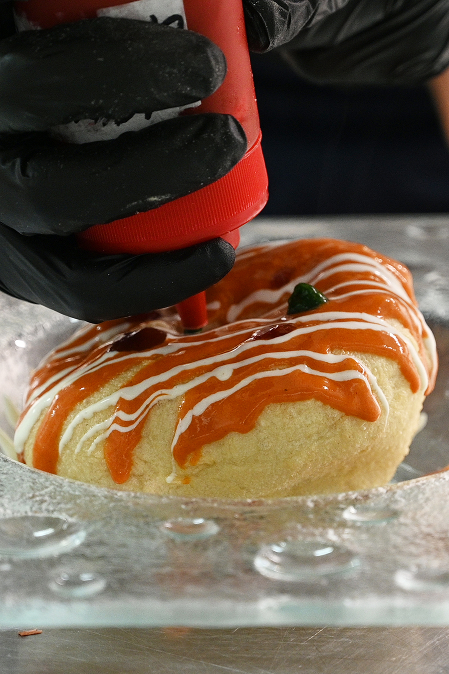 Pulire i gamberi da testa e carapaci e preparare una tartare aromatizzata con sale, pepe, timo, basilico, olio all’aglio e zeste di limone. Prendere un disco di impasto, farcirlo con la tartare precedentemente preparata e chiuderlo, sovrapponendo al disco farcito, un secondo disco dello stesso diametro di quello utilizzato come base. Mettere a scaldare l’olio in un tegame a bordo alto. Per una frittura ottimale dovrà raggiungere i 200 °C. Immergervi la bolla di pizza per 2 minuti e 40 secondi. Nel frattempo, lavorare le parti meno nobili del gambero, spadellandole e preparando una salsetta, aromatizzando con gli stessi ingredienti utilizzati per aromatizzare la tartare. Una volta pronto il fritto, scolare ed adagiarlo su carta assorbente per asciugarne l’olio in eccesso.