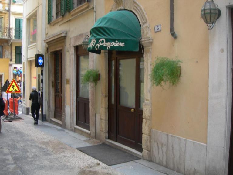 Arriviamo in auto e Verona e, dopo aver parcheggiato il più vicino possibile al centro, Maddalena ci guida per le straduzze attorno a Piazza delle Erbe, fino ad arrivare in una ministraduzza del centro dove si trova l’ingresso con l’insegna verde de “Al Pompiere”.