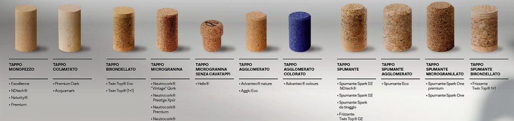 L’ampia gamma di tappi prodotti va a coprire le specifiche esigenze di ogni tipologia di vino e le esigenze del singolo produttore, la lavorazione raggiunge infatti delle vette sartoriali, preparando tappi su misura per ciascun cliente, anche in quantitativi estremamente ridotti.