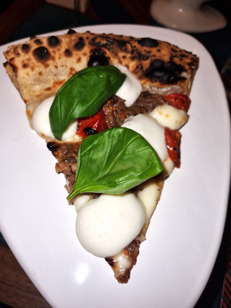La prima pizza “Revolution” è l’imperdibile Nero di Marinara con San Marzano DOP datterino rosso, aglio nero di Voghera e origano di montagna (Pizza dell’anno 2024 per la Guida 50 Top Pizza “Latteria Sorrentina Award”). L’abbinamento, anch’esso azzeccatissimo, è col Negramaro Rosato “Tacco Rosa” di Tenute Stefàno.