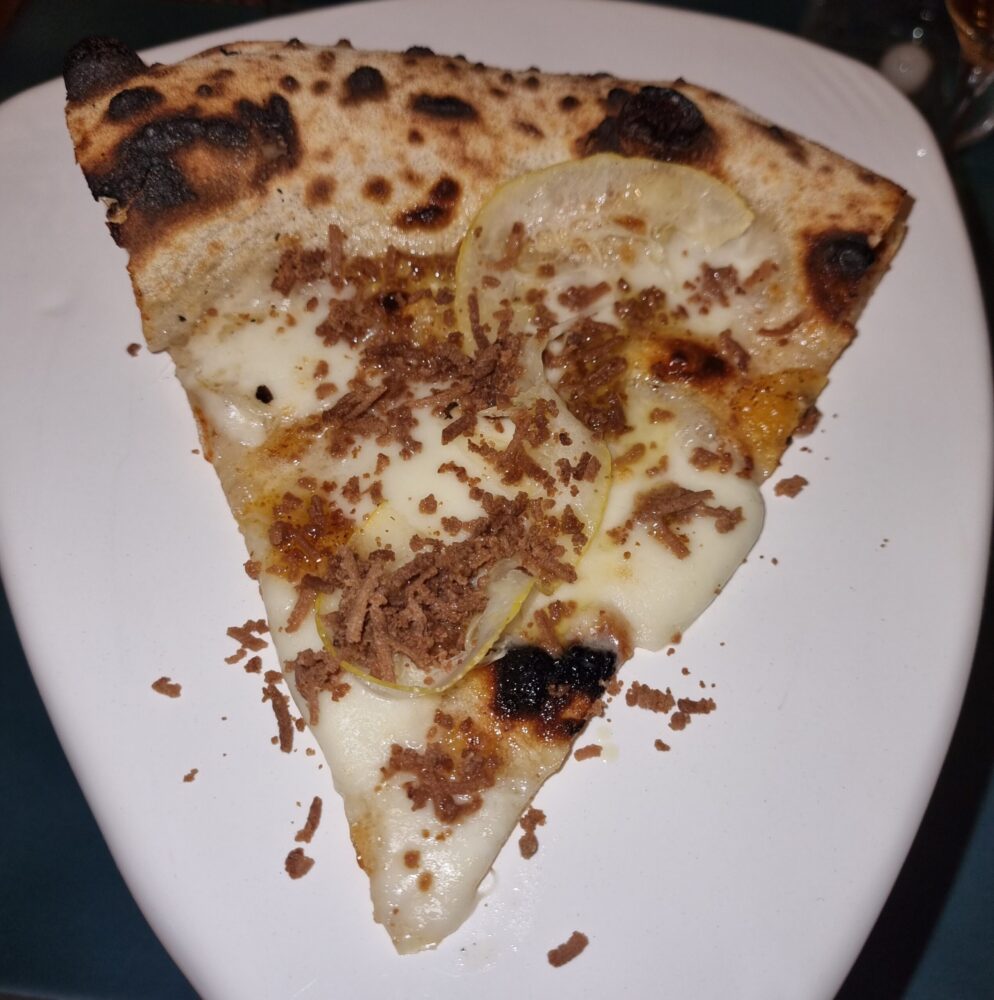 Il vino più importante del pairing, un ottimo Chardonnay borgognone prodotto da Pierre Ponnelle, lo abbiamo abbinato al Sogno di Bottarga (Fiordilatte, Cosacavaddu ibleo stagionato 12 mesi, Bottarga di Tonno Rosso “Testa”, limoni costa d’Amalfi marinati in aceto di mele “Il Tenello”, burro Fattorie Fiandino, Olio EVO), ultima pizza del mio menù di degustazione che avrei preferito meno “spinta” sulle note agrumate che un pochino coprivano la bontà della bottarga che è passata in secondo piano.